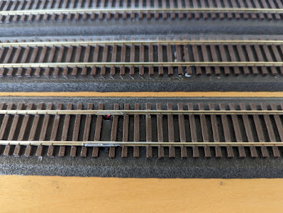 I soldered the tracks on the PCB ties. One side of the isolated joiners was still in good shape. I moved them to connect the two tracks on each side, which helps with vertical and horizontal alignments: